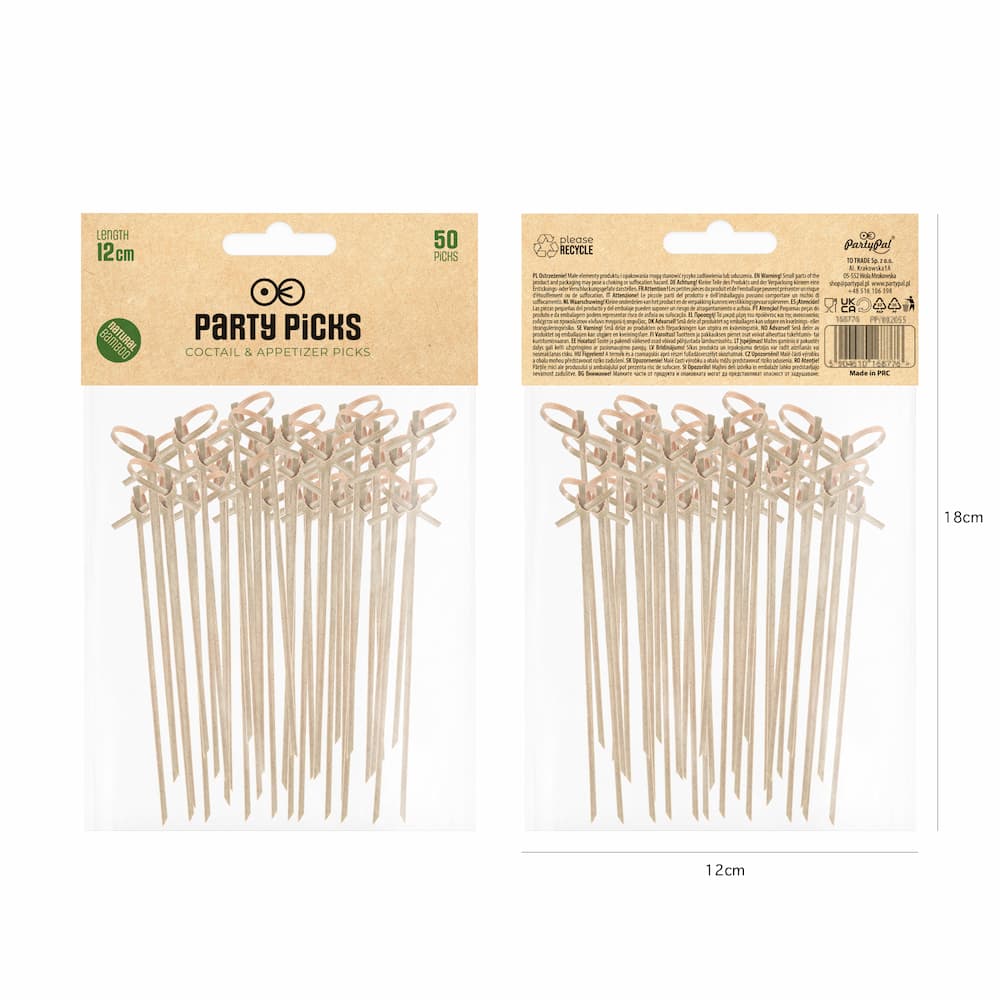Patyczki bambusowe do przekąsek mają wysokość 12 cm. W opakowaniu znajduje się 50 sztuk ozdobnych pikerów.