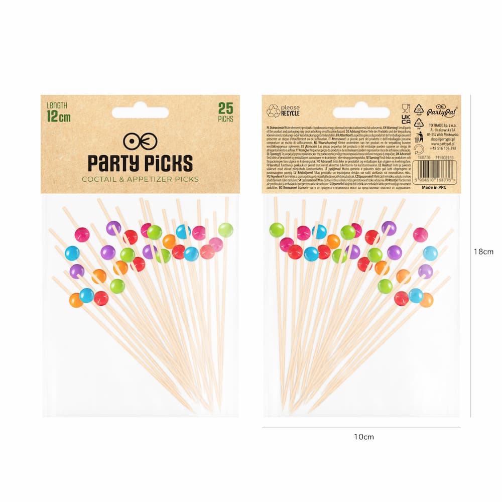Patyczki bambusowe do przekąsek z kolorowymi kulkami mają wysokość 12 cm. W opakowaniu znajduje się 25 sztuk ozdobnych pikerów.