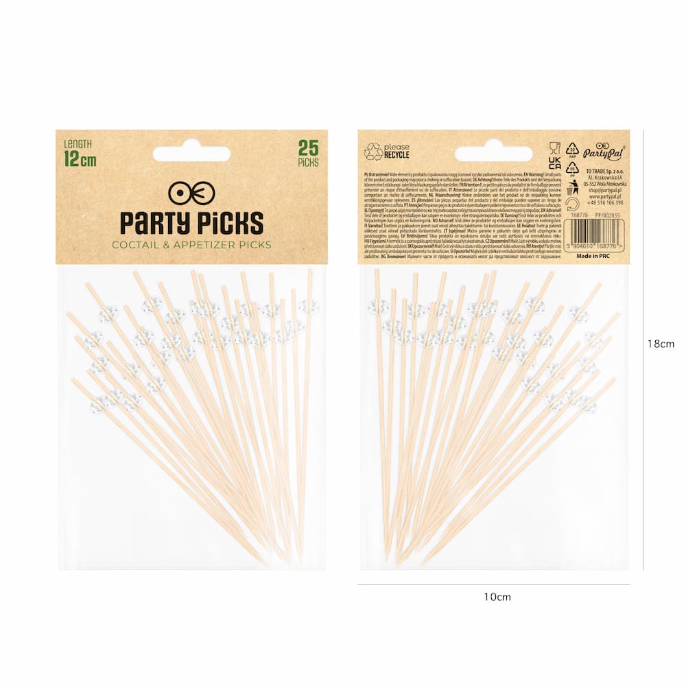 Patyczki bambusowe do przekąsek z kryształkami mają wysokość 12 cm. W opakowaniu znajduje się 25 sztuk ozdobnych pikerów.