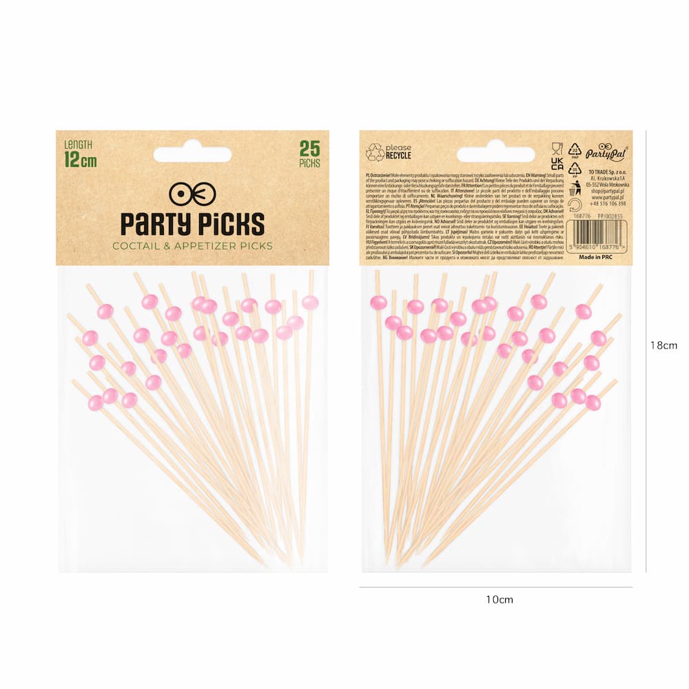 Patyczki bambusowe do przekąsek z różowymi kulkami mają wysokość 12 cm. W opakowaniu znajduje się 25 sztuk ozdobnych pikerów.