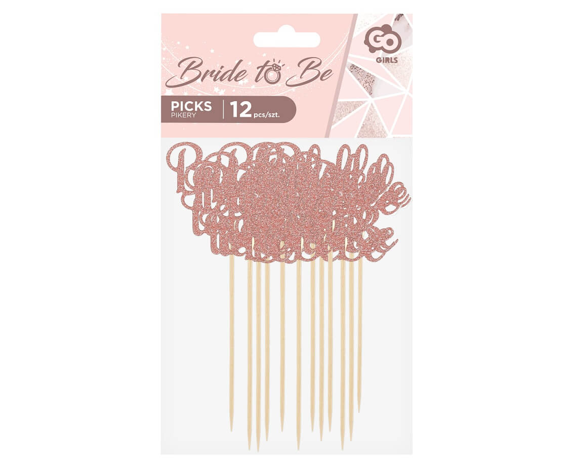 Pikery dekoracje do muffinek babeczek wieczór panieński Bride To Be rose gold brokatowe, 12 szt.