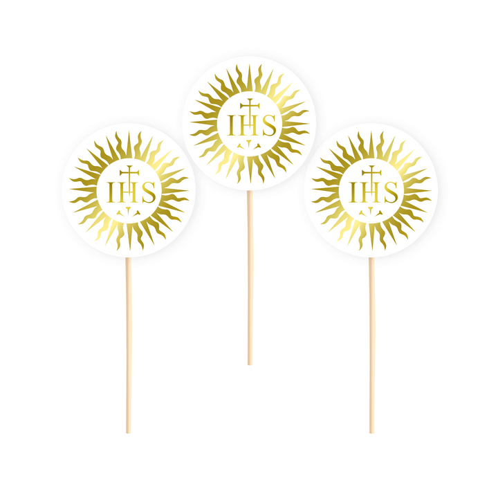 Dekoracje na piku ze złotymi ornamentami oraz napisem IHS będzie perfekcyjnym wykończeniem słodkich wypieków np. babeczek, ciasteczek czy nawet tortu na Komunie Świętą. Są minimalistyczne, dzięki czemu uzyskujemy delikatny efekt dekoracji, która z pewnością wpasuje się w całe komunijne otoczenie.