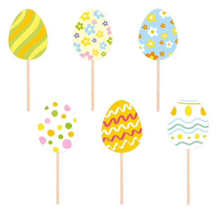 Pikery do babeczek pisanki mają szerokość motywu ok. 3,8 cm i wysokość ok. 5 cm. W opakowaniu znajduje się 6 papierowych topperów jajeczek na drewnianych patyczkach.