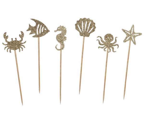 Brokatowe pikery na babeczki lub tort w motywie podwodnej krainy świetnie sprawdzą się na morskich przyjęciach. Pięknie mienią się w blasku świeczek, a ich wygląd sprawi, że słodkości będą smakować jeszcze lepiej!