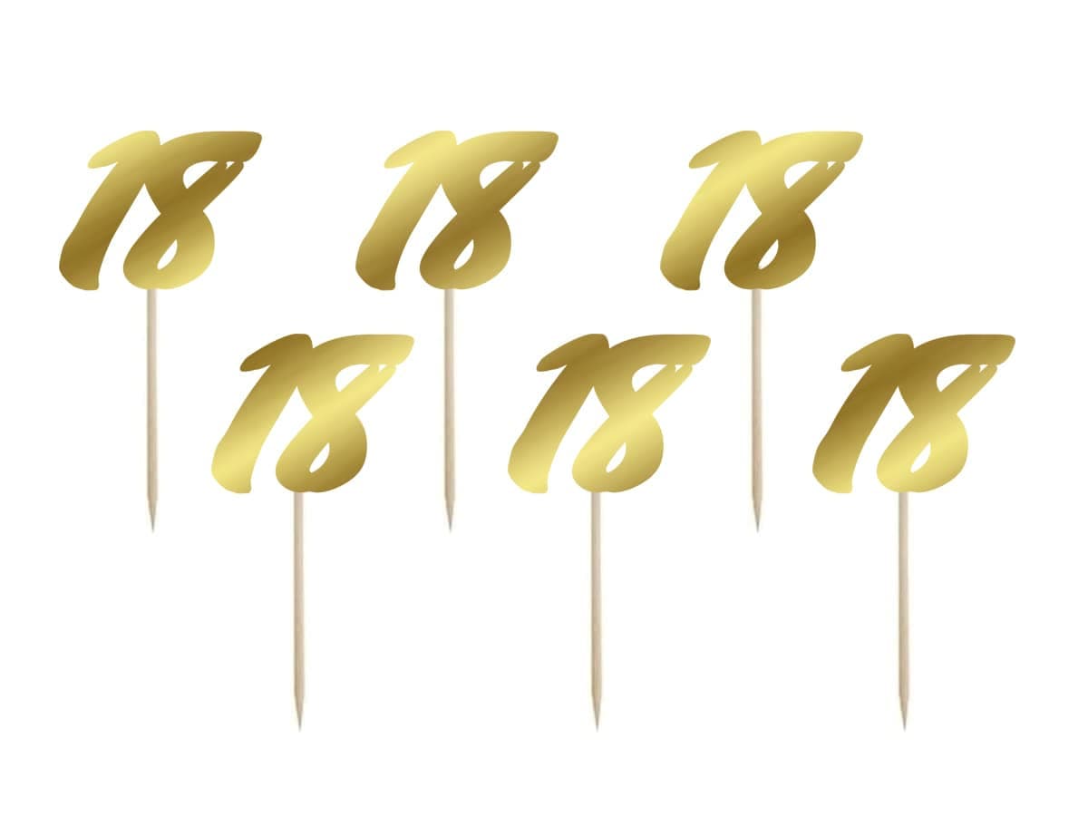 Pikery dekoracje do muffinek babeczek 18 urodziny osiemnastka złote, 6 szt.