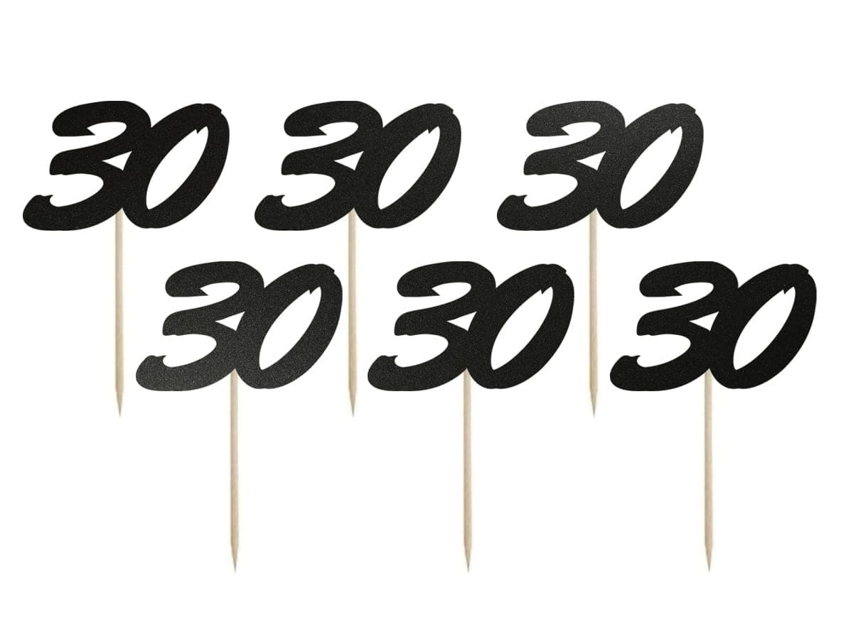 Pikery dekoracje do muffinek babeczek 30 urodziny trzydziestka czarne, 6 szt.