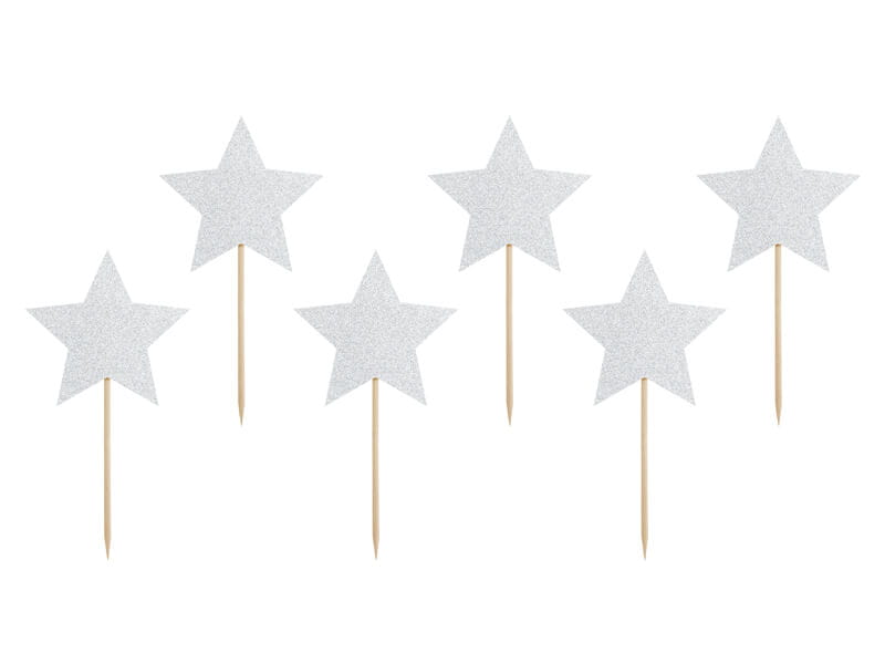 Pikery dekoracje do muffinek babeczek gwiazdki srebrne brokatowe, 6 szt.
