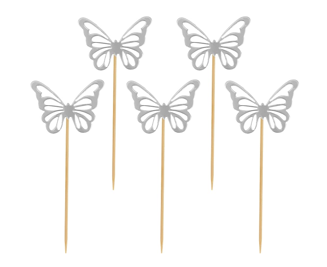 Pikery do babeczek motyle w kolorze srebrnym mają wysokość z patyczkiem 11,5 cm oraz szerokość 5,5 cm. W opakowaniu znajduje się 12 sztuk.