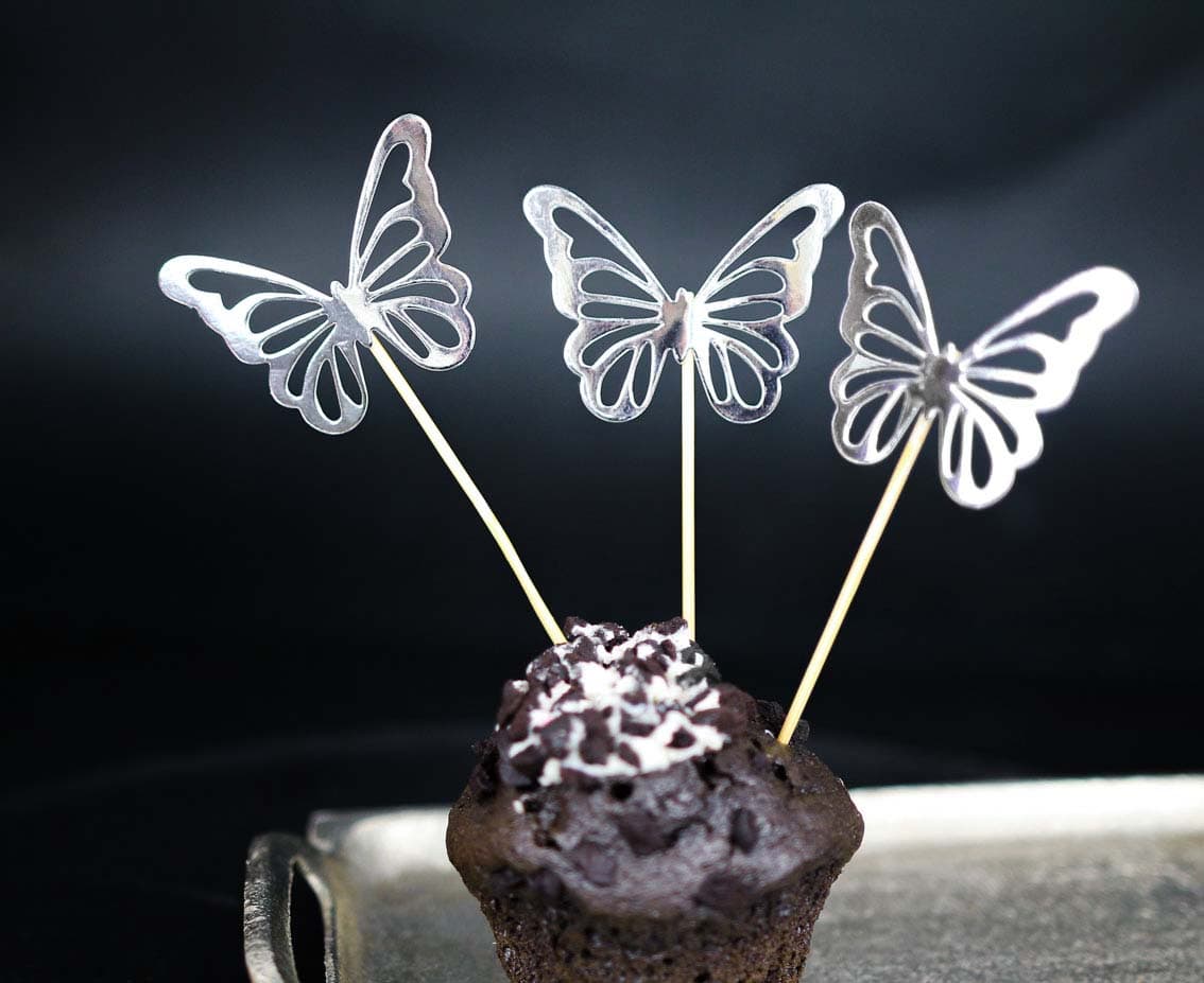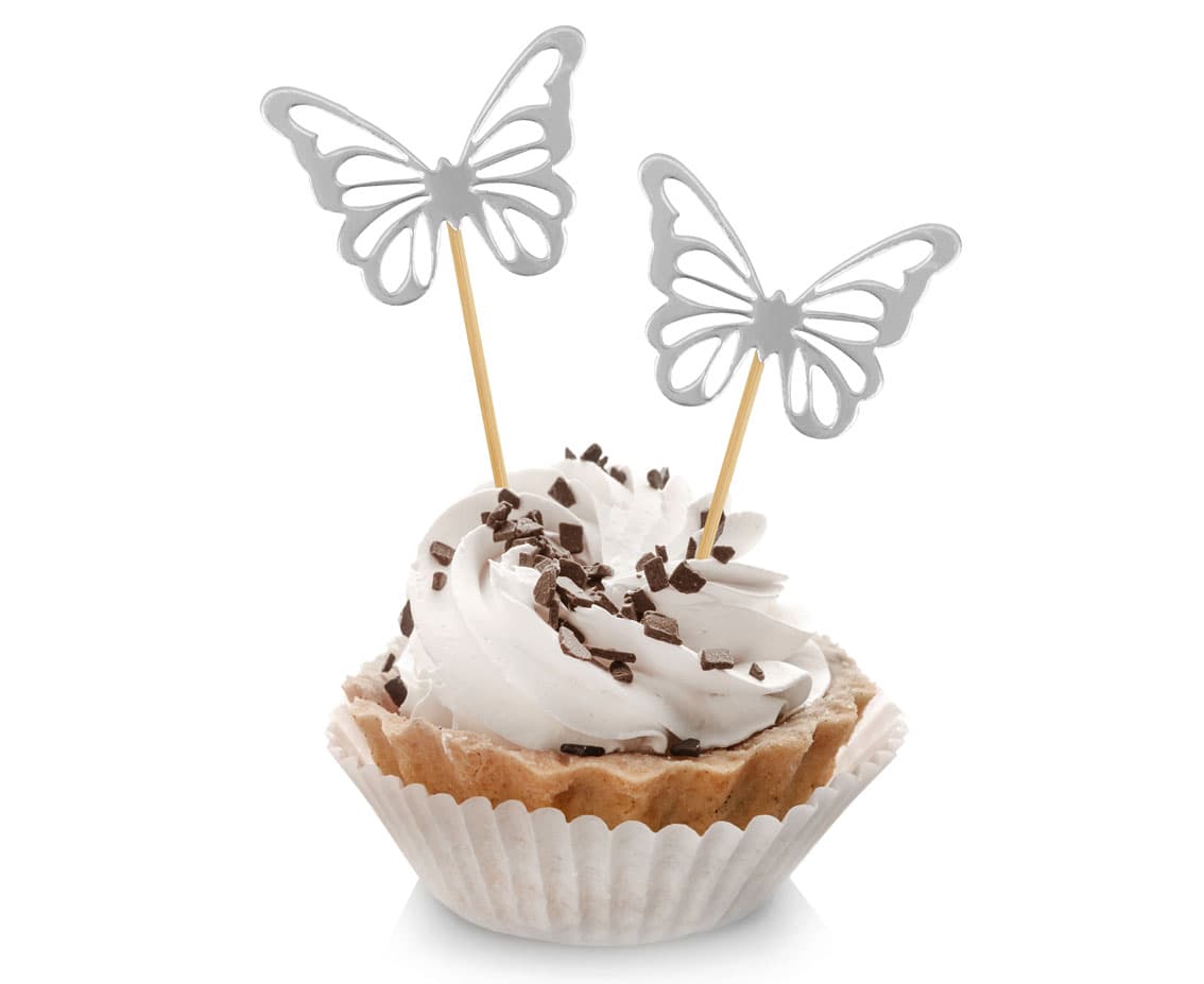 Pikery dekoracje do muffinek babeczek Motylki srebrne, 12 szt.