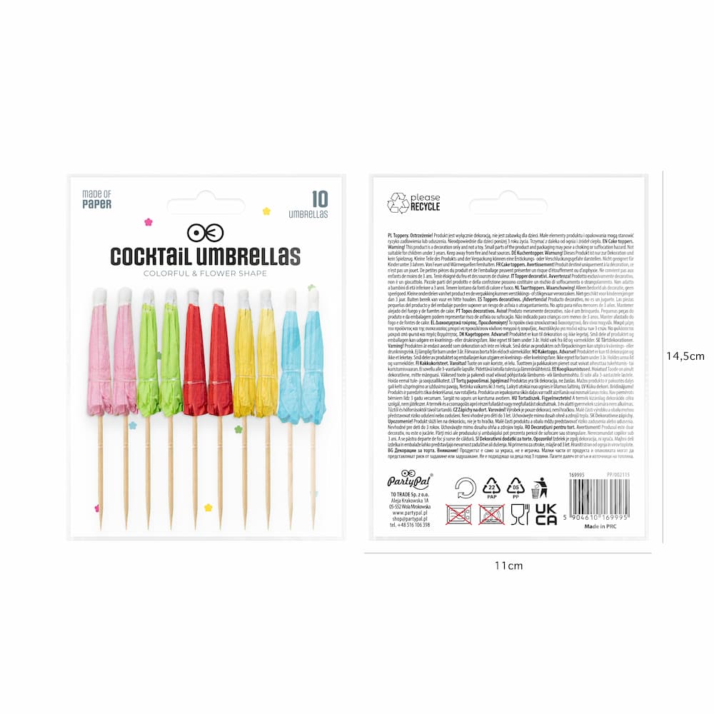Pikery parasolki kolorowe mają wysokość 10 cm. W opakowaniu znajduje się 10 sztuk ozdobnych pikerów.