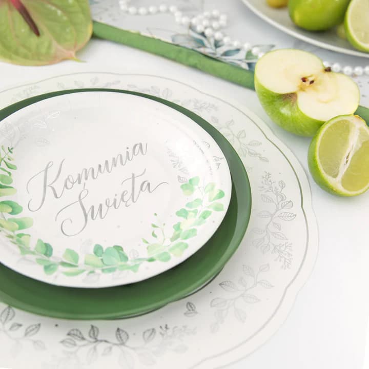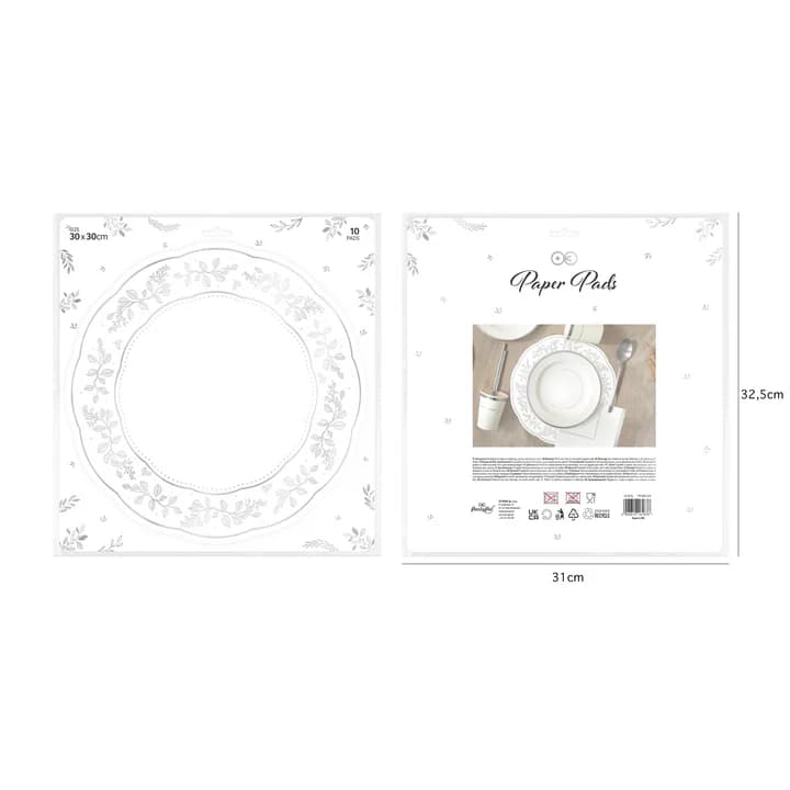 Podtalerze papierowe białe ze srebrnymi zdobieniami mają średnicę ok. 30 cm. W opakowaniu znajduje się 10 sztuk.
