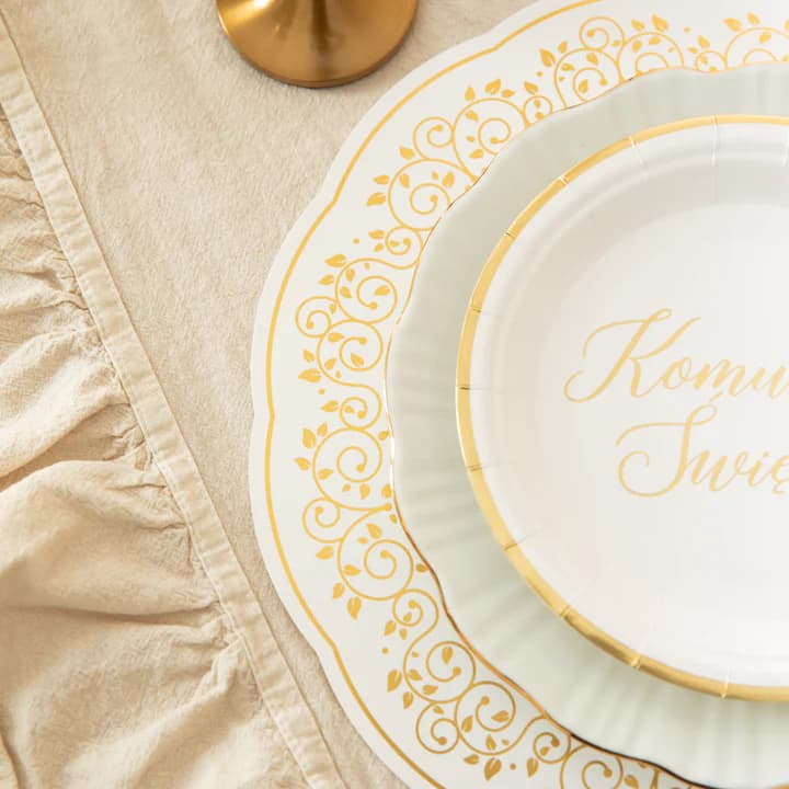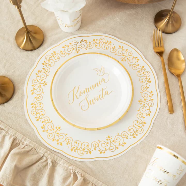 Dodaj elegancji swojemu stołowi dzięki pięknym podkładkom w biało-złotej tonacji. Subtelne zdobienia sprawiają, że cała aranżacja nabiera uroczystego charakteru. Idealne do podkreślenia stylu komunijnego stołu – piękno i funkcjonalność w jednym!.