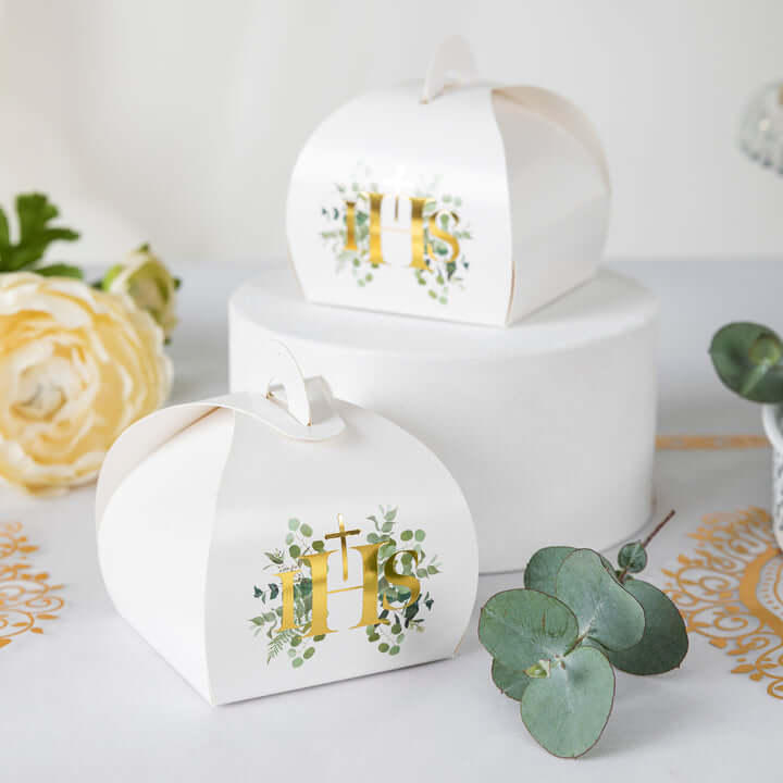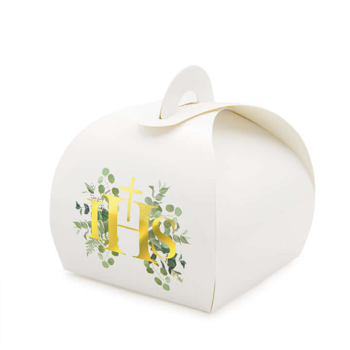 Pudełeczka komunijne na drobne prezenty dla gości w kolorze białym ze złotym, metalizowanym ornamentem IHS oraz motywem roślinności zachwycą uczestników przyjęcia. W środku możemy umieścić słodki poczęstunek w postaci czekoladki lub pralinki.