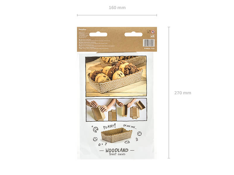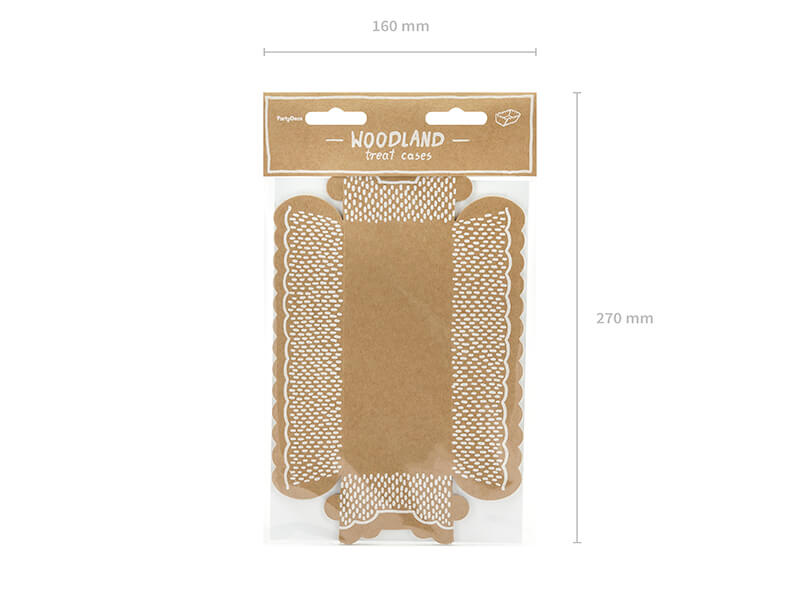 Foremki na słodycze Woodland zostały wykonane z papieru kraft. Wymiary pudełka po złożeniu wynoszą ok. 6,6 x 15 x 4 cm. W opakowaniu znajduje się 6 sztuk.