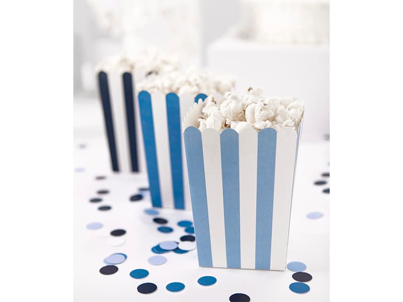 Pudełka na przekąski popcorn chipsy paski niebieskie białe granatowe, 6 szt.