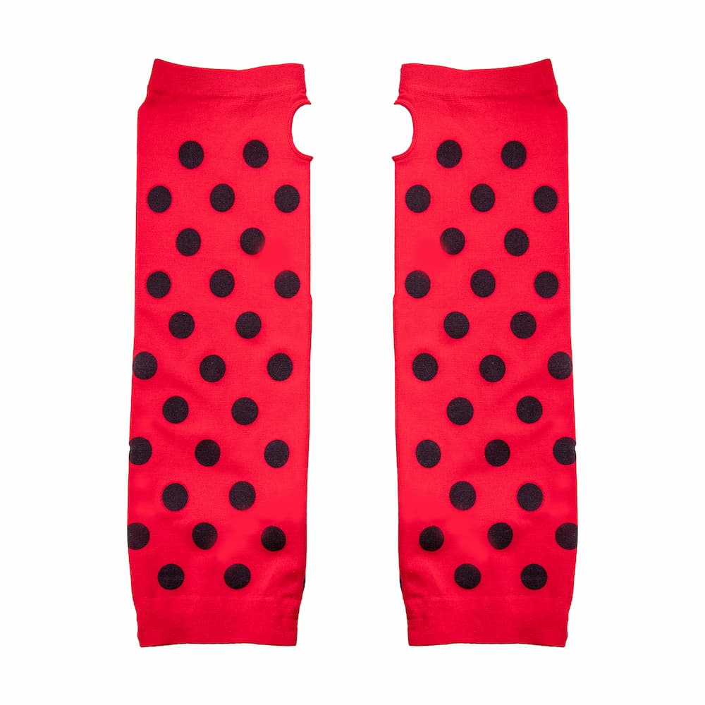 Rękawiczki bez palców czerwone w czarne kropki mają długość 30 cm. Rozmiar uniwersalny.