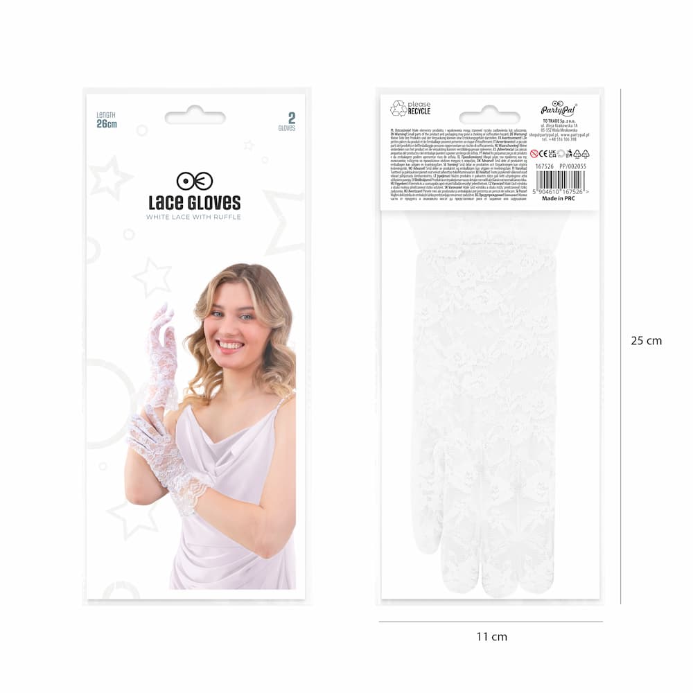 Rękawiczki koronkowe białe mają długość 26 cm. Rozmiar uniwersalny.