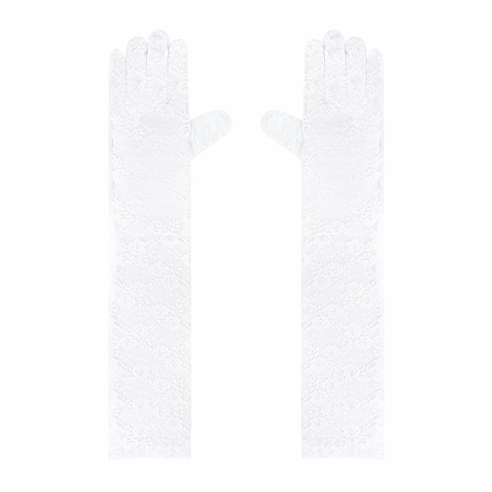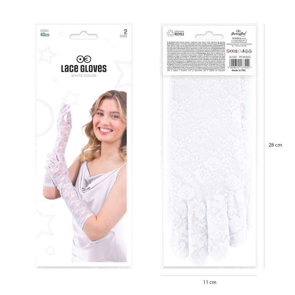 Rękawiczki koronkowe białe mają długość 40 cm. Rozmiar uniwersalny.