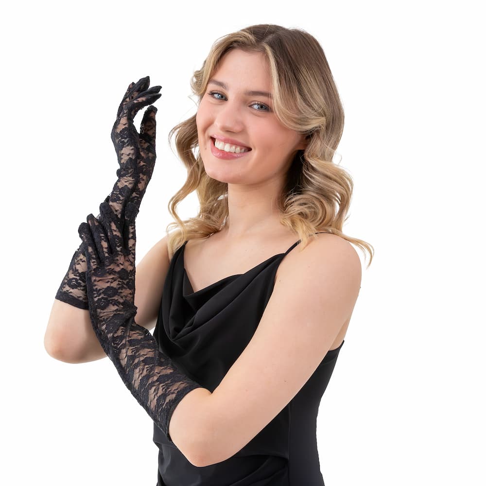 Spektakularne rękawiczki koronkowe czarne 40 cm zamienią każdą stylizację w odważny, wieczorowy look. Długa linia aż do łokcia optycznie wysmukla ręce i dodaje całości teatralnego charakteru, idealnego na bal, karnawał, imprezę burlesque lub elegancki bankiet. Czerń pięknie kontrastuje z jasnymi sukienkami i biżuterią, tworząc bardzo efektowne połączenia. To dodatek, który robi wrażenie od pierwszego spojrzenia i nie pozwala przejść obok Ciebie obojętnie. Jeśli szukasz mocnego akcentu, te czarne długie rękawiczki koronkowe są stworzone właśnie dla Ciebie