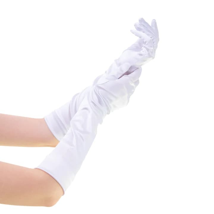 Satynowe rękawiczki w kolorze białym mają długość ok. 40 cm. W opakowaniu znajduje się 1 para rękawiczek.