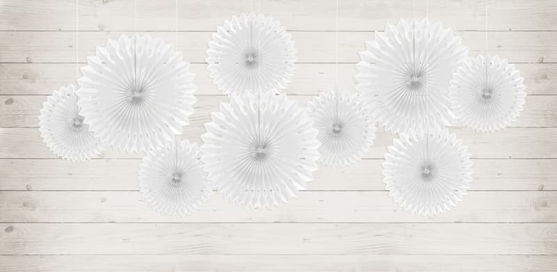 Rozety dekoracyjne białe są wykonane z bibuły. Po złożeniu mają średnice ok. 20 cm, 25 cm i 30 cm. Produkt wielokrotnego użytku, montaż przy pomocy załączonego spinacza.