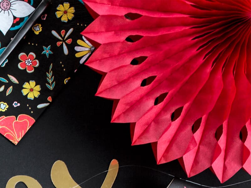 Rozety dekoracyjne czerwone są wykonane z bibuły. Po złożeniu mają średnice ok. 20 cm, 25 cm i 30 cm. Produkt wielokrotnego użytku, montaż przy pomocy załączonego spinacza.