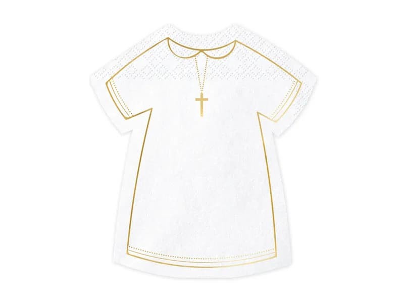 Serwetki papierowe w kształcie komunijnej alby pięknie zaprezentują się na stole podczas Pierwszej Komunii Świętej. Klasyczny design z elementami złota perfekcyjnie wkomponują się w rustykalną dekorację w barwach brązu i beżu. Zostały zaprojektowane specjalnie z myślą o tych ważnych i wyjątkowych momentach, aby dodać blasku i elegancji podczas tego szczególnego dnia.