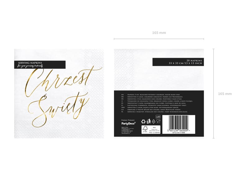 W opakowaniu znajduje się 20 sztuk serwetek papierowych na chrzest święty o wymiarach 33x33 cm po rozłożeniu.
