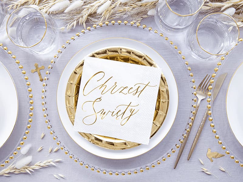 Białe serwetki ze złotym napisem 'Chrzest Święty' idealnie sprawdzą się na przyjęcie z okazji chrztu świętego zarówno dla dziewczynki, jak i dla chłopca. Są uniwersalne, a swoją delikatnością podkreślą charakter przyjęcia.