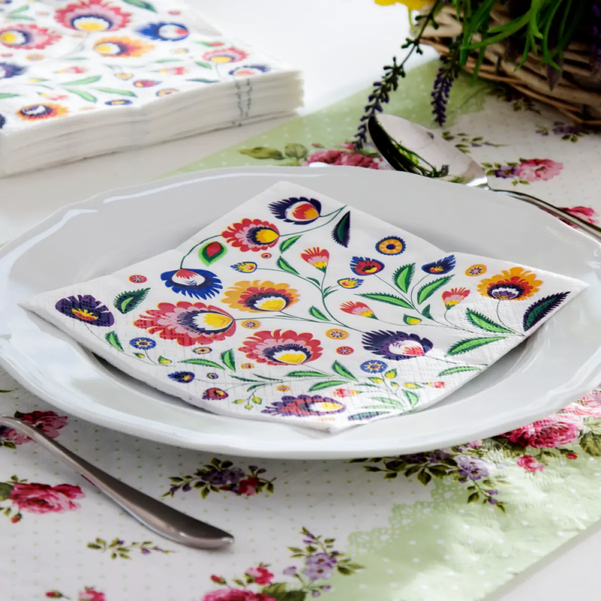 Serwetki papierowe z kolorowym nadrukiem folk to ozdoba stołu, która wprowadzi do wnętrza wiejski, rustykalny klimat. Nadruk ten przedstawia zazwyczaj motywy inspirowane kulturą ludową, takie jak rośliny, zwierzęta, geometryczne wzory, a także klasyczne ludowe motywy takie jak koguty, kwiaty i drzewa. Te wzory są często utrzymane w kontrastujących kolorach - czerwień, niebieski, zielony, żółty, co sprawia, że serwetki są atrakcyjne wizualnie i dodają uroku wnętrzu. Sprawdzą się zarówno na wielkanocnym stole, jak i na wiele innych okazji, na których chcemy stworzyć oryginalną i ciekawą dekorację.