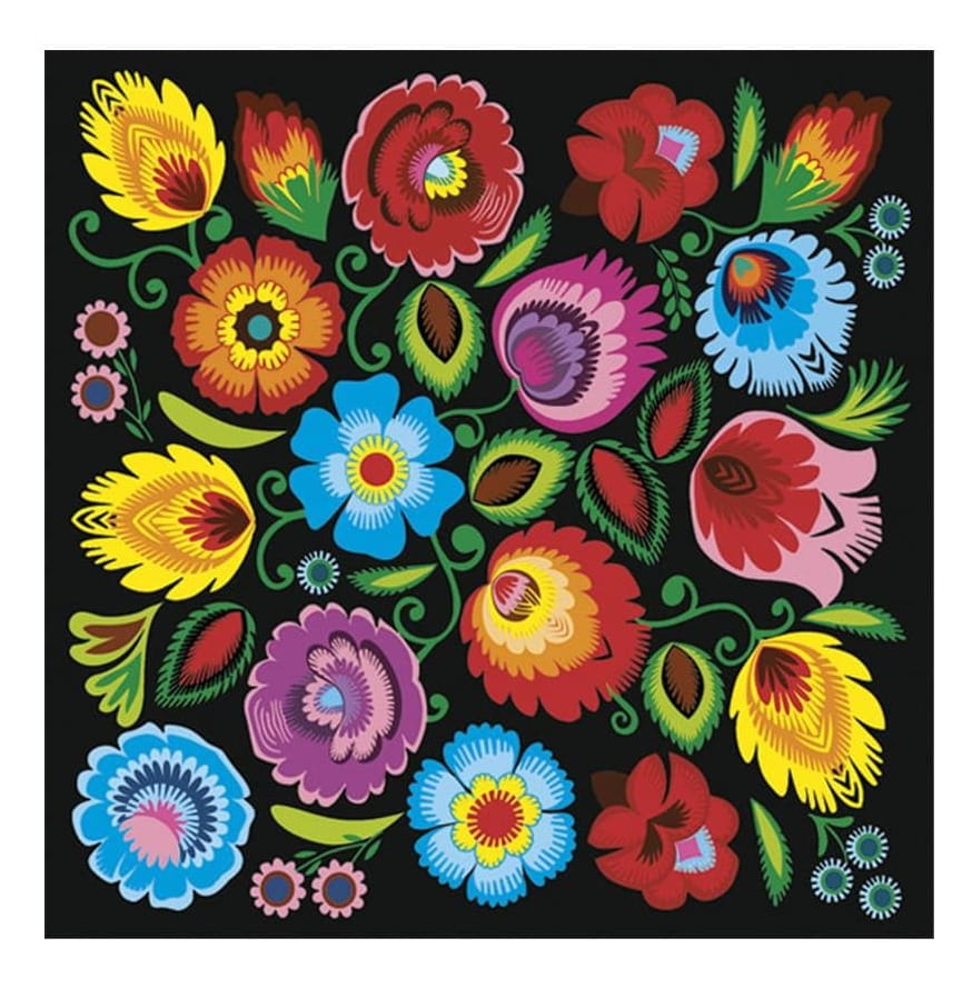 Eleganckie i wyraziste – te serwetki to hołd dla tradycyjnego łowickiego wzoru. Czarna baza podkreśla intensywność kolorów ludowych motywów. Świetnie sprawdzą się na tematycznych przyjęciach i świętach. Łączą tradycję z nowoczesnym stylem stołu.