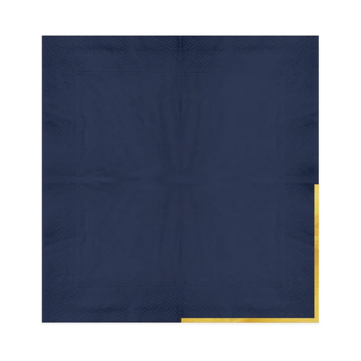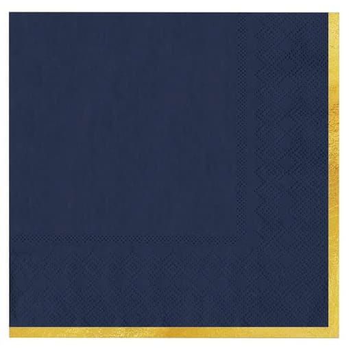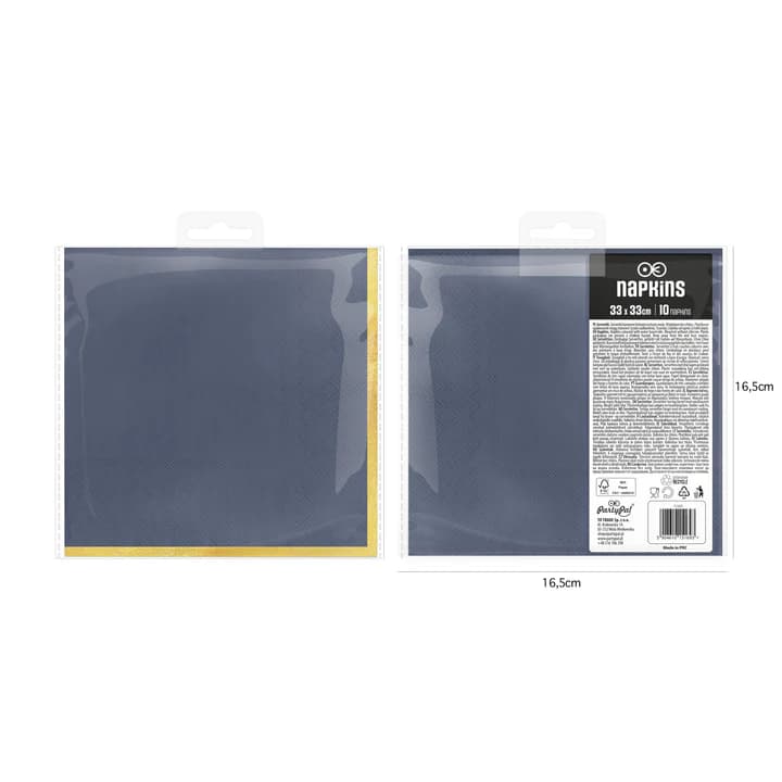 Serwetki papierowe ze złotym brzegiem w kolorze granatowym mają wymiary ok. 33 × 33 cm po rozłożeniu. W opakowaniu znajduje się 10 sztuk.