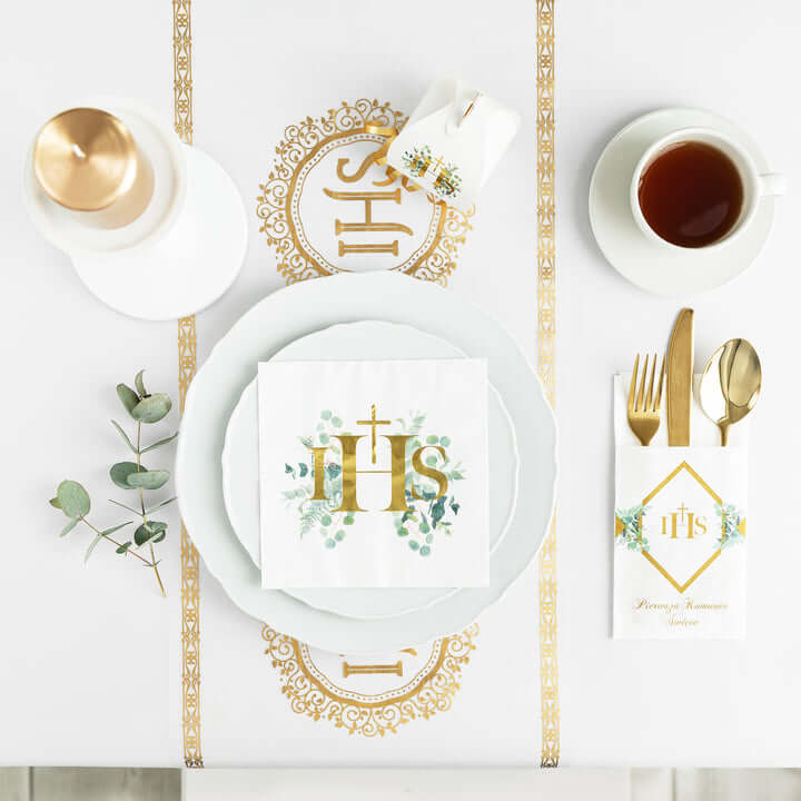 Białe serwetki ze złotym, metalizowanym napisem IHS oraz motywem roślinności to dodatek, o którym nie możemy zapomnieć podczas dekorowania stołu. Prezentują się elegancko i minimalistycznie, co pozwala na idealnie ich dopasowanie. Motyw roślinności zdecydowanie ożywia całą dekoracje.