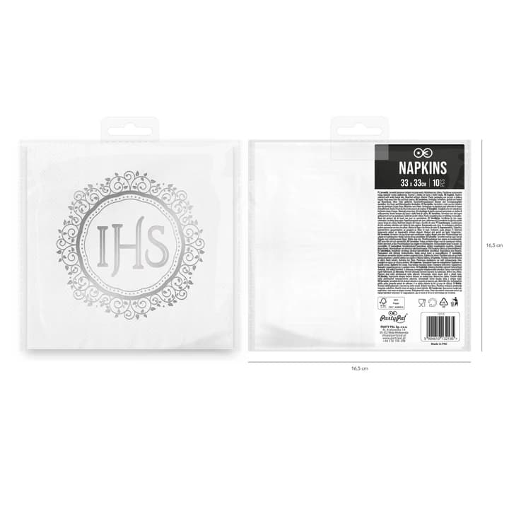 Serwetki papierowe ze srebrnym ornamentem IHS mają wymiary 33 × 33 cm po rozłożeniu. W opakowaniu znajduje się 10 sztuk.