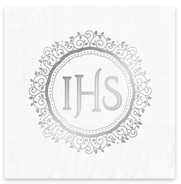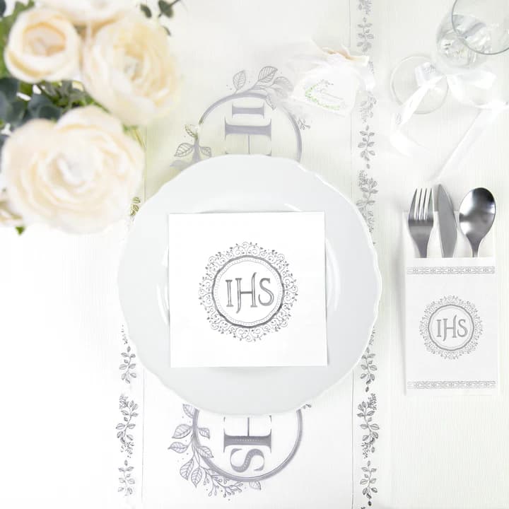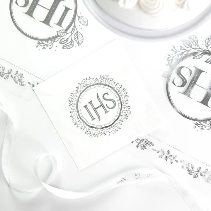 Subtelne i eleganckie nakrycie stołu na Twoje przyjęcie! Serwetki komunijne z motywem IHS w srebrnym kolorze doskonale komponują się z innymi dekoracjami komunijnymi, dodając uroczystości wyjątkowego charakteru.