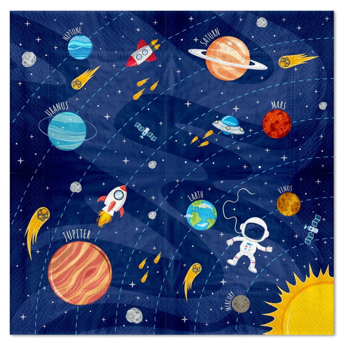 Serwetki papierowe Kosmos Planety wspaniale sprawdzą się w utrzymaniu czystości rączek i buź dzieciaków na przyjęciu z motywem kosmosu. Świetnie komponują się z innymi elementami z kolekcji Kosmos Planety.