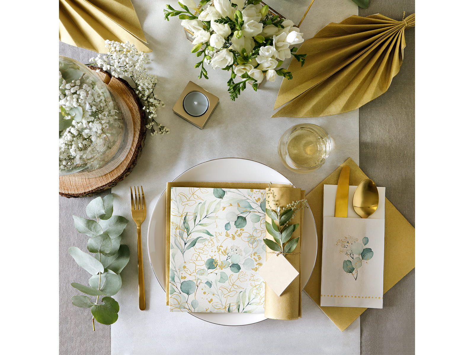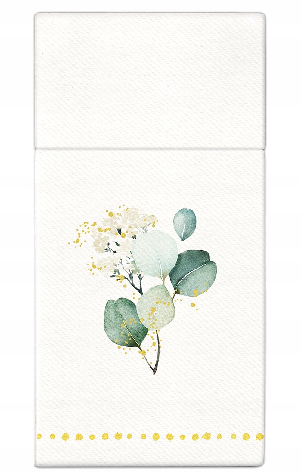 Białe kieszonki na sztućce z motywem eukaliptusa to elegancki i świeży akcent na stole. Delikatny wzór eukaliptusa w subtelnych odcieniach zieleni dodaje naturalnego uroku i wyrafinowania, idealnie komponując się z różnymi stylami dekoracji. Wprowadź do swojego stołu elegancję dzięki tym wyjątkowym serwetkom, które z pewnością zachwycą gości.