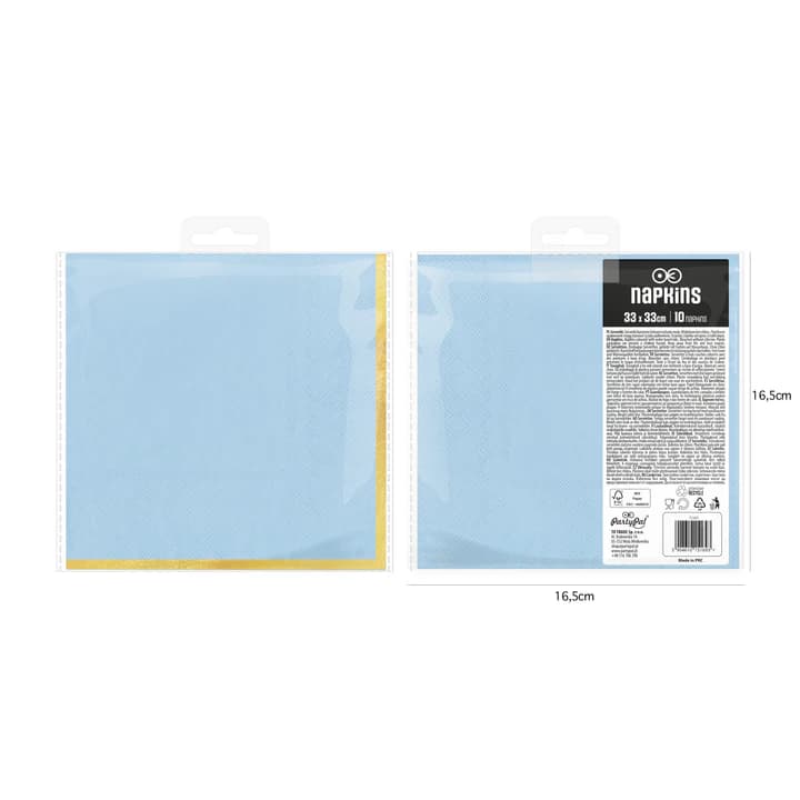 Serwetki papierowe ze złotym brzegiem w kolorze niebieskim mają wymiary ok. 33 × 33 cm po rozłożeniu. W opakowaniu znajduje się 10 sztuk.