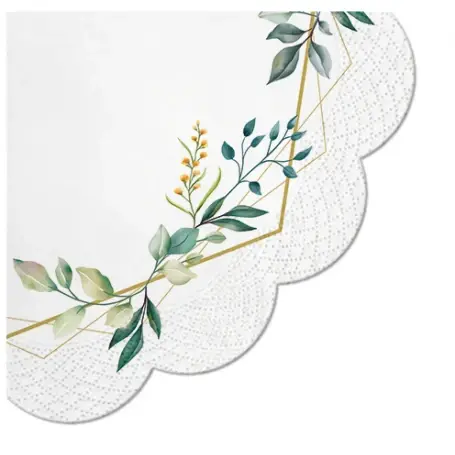 Okrągłe serwetki w liście charakteryzują się pięknym motywem roślinności, umieszczonym na tle białego koloru, a także dodatkowo ozdobione są złotym akcentem. Motyw ten dodaje elegancji i stylu, a także sprawia, że serwetki są bardzo estetyczne i niebanalne. Papierowe serwetki w kolorze białym z elementami złota i roślin to motyw, który sprawdzi się na wiele okazji - wesela, urodzin, chrzest czy komunię.
