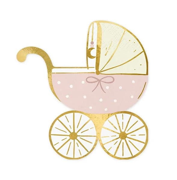 Serwetki papierowe Różowy Wózek wspaniale będą wyglądać podczas świętowania Baby Shower dziewczynki. Złote, metalizowane elementy na serwetkach pięknie prezentują się na stole i świetnie współgrają z innymi dekoracjami na baby shower.