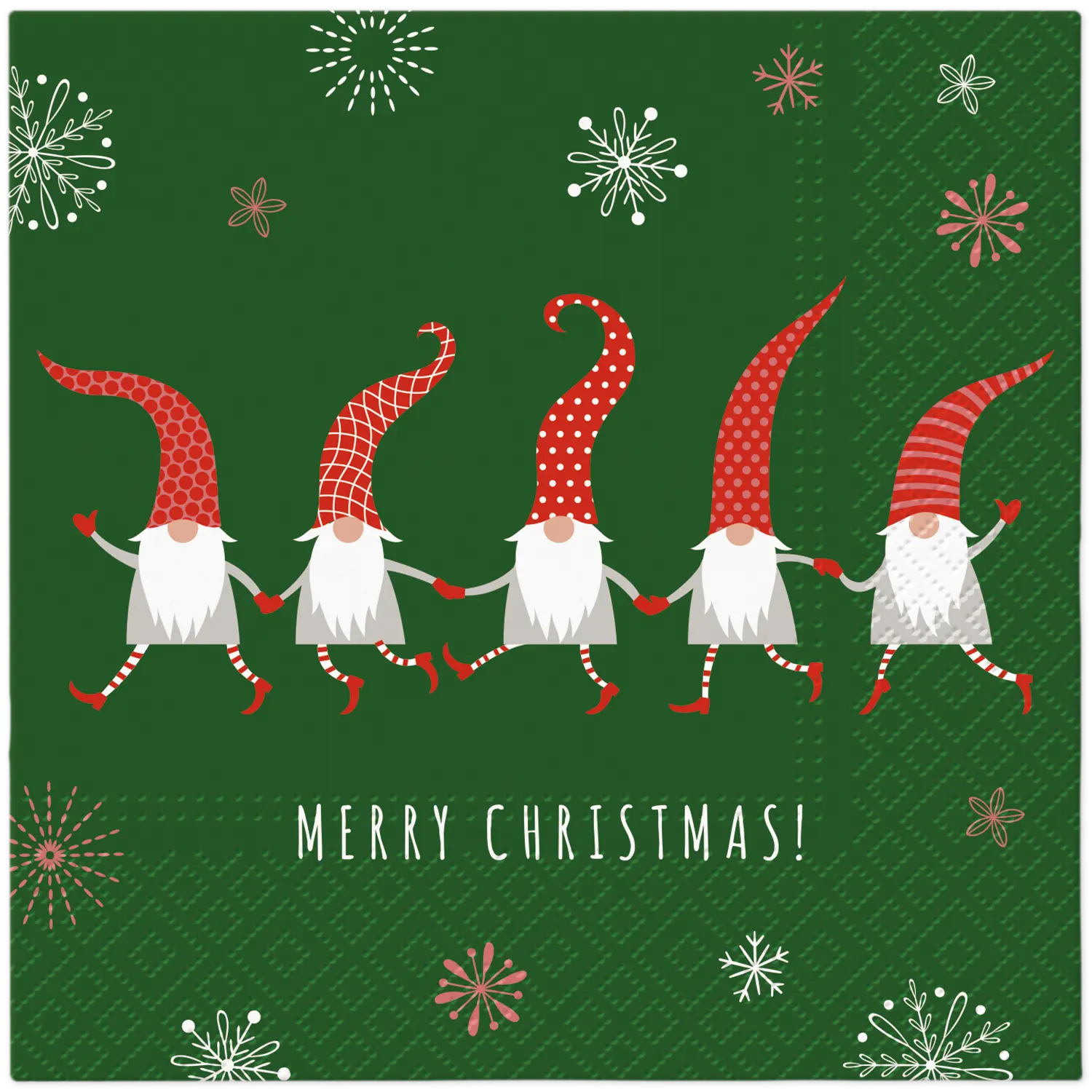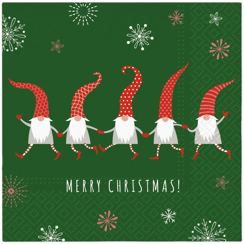 Zielone tło, wesołe skrzaty i napis Merry Christmas – oto przepis na stół pełen radości. Te serwetki świąteczne z gnomkami dodają koloru i humoru każdej kolacji. W opakowaniu jest 20 sztuk, więc każdy gość dostaje swoją dawkę świątecznej energii. Postaw na serwetki Merry Christmas, by atmosfera rozgrzała się szybciej niż grzane wino.