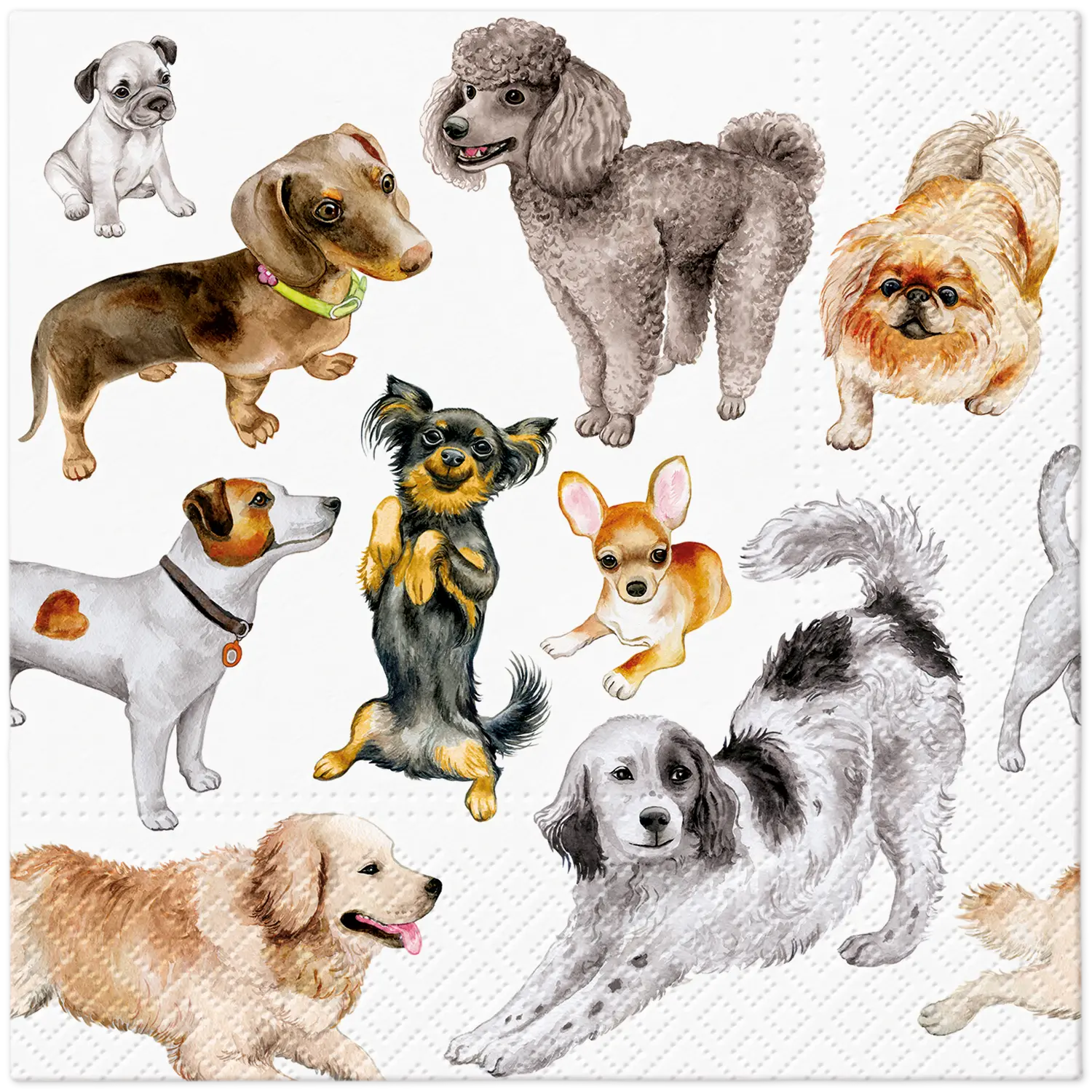 Serwetki papierowe Pieski mają wymiary 33 x 33 cm po rozłożeniu. W opakowaniu znajduje się 20 sztuk.
