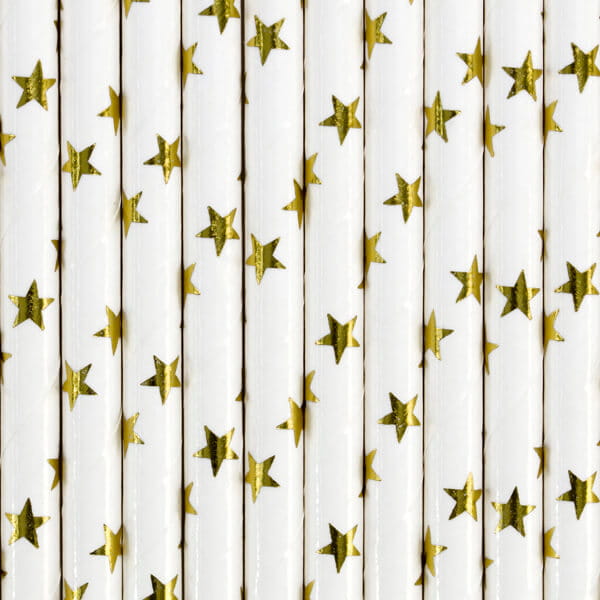 Słomki papierowe białe w złote gwiazdki, 19,5 cm