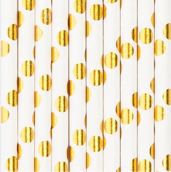 Słomki papierowe białe w złote kropki, 10 szt.