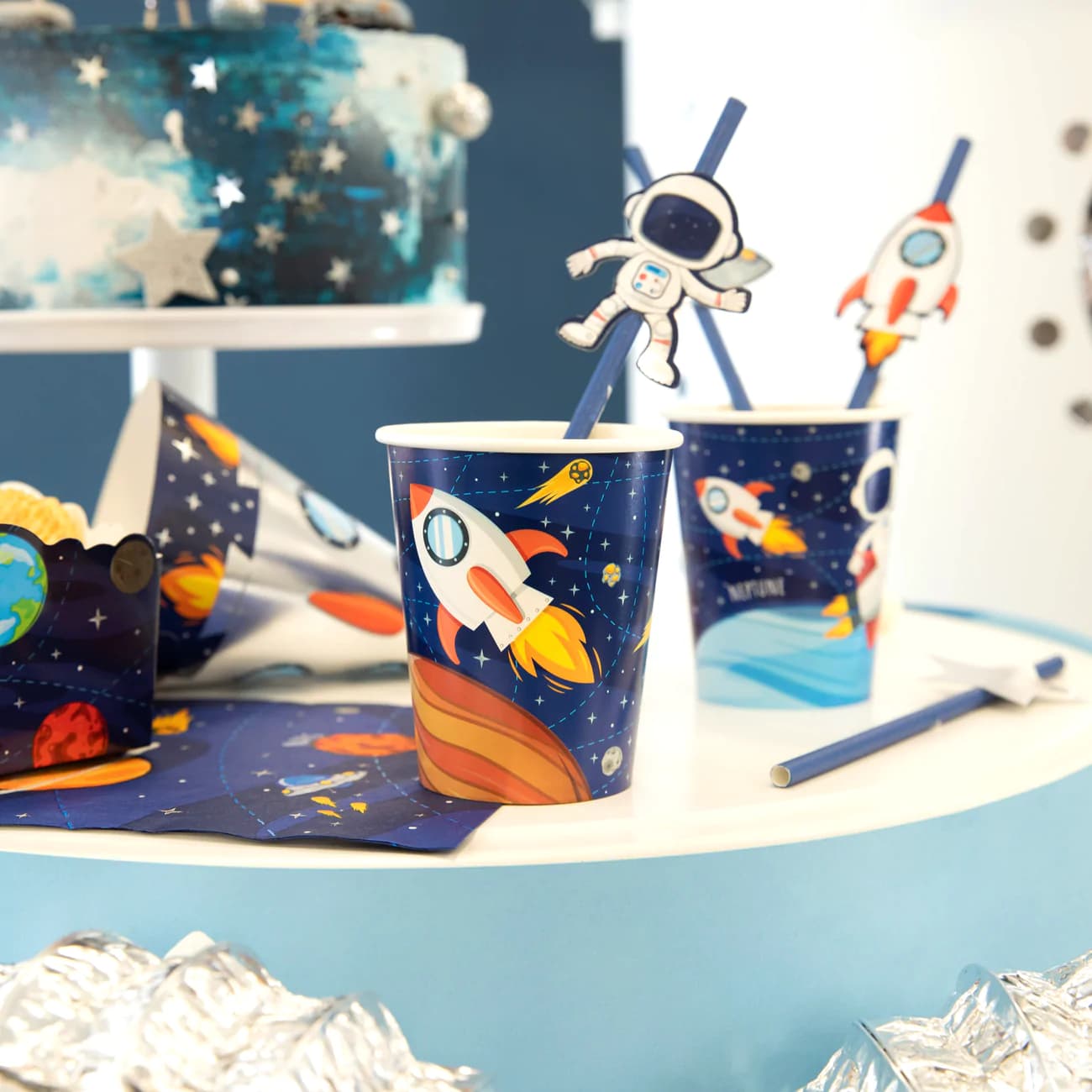 Słomki papierowe Kosmos Planety to granatowe rurki do picia ozdobione medalionami z gwiazdkami, statkiem kosmicznym, rakietą i kosmonautą, które zauroczą każdego fana Kosmosu. Kolorowe wzory będą fantastycznie wyglądać w kubeczkach z tej samej kolekcji.