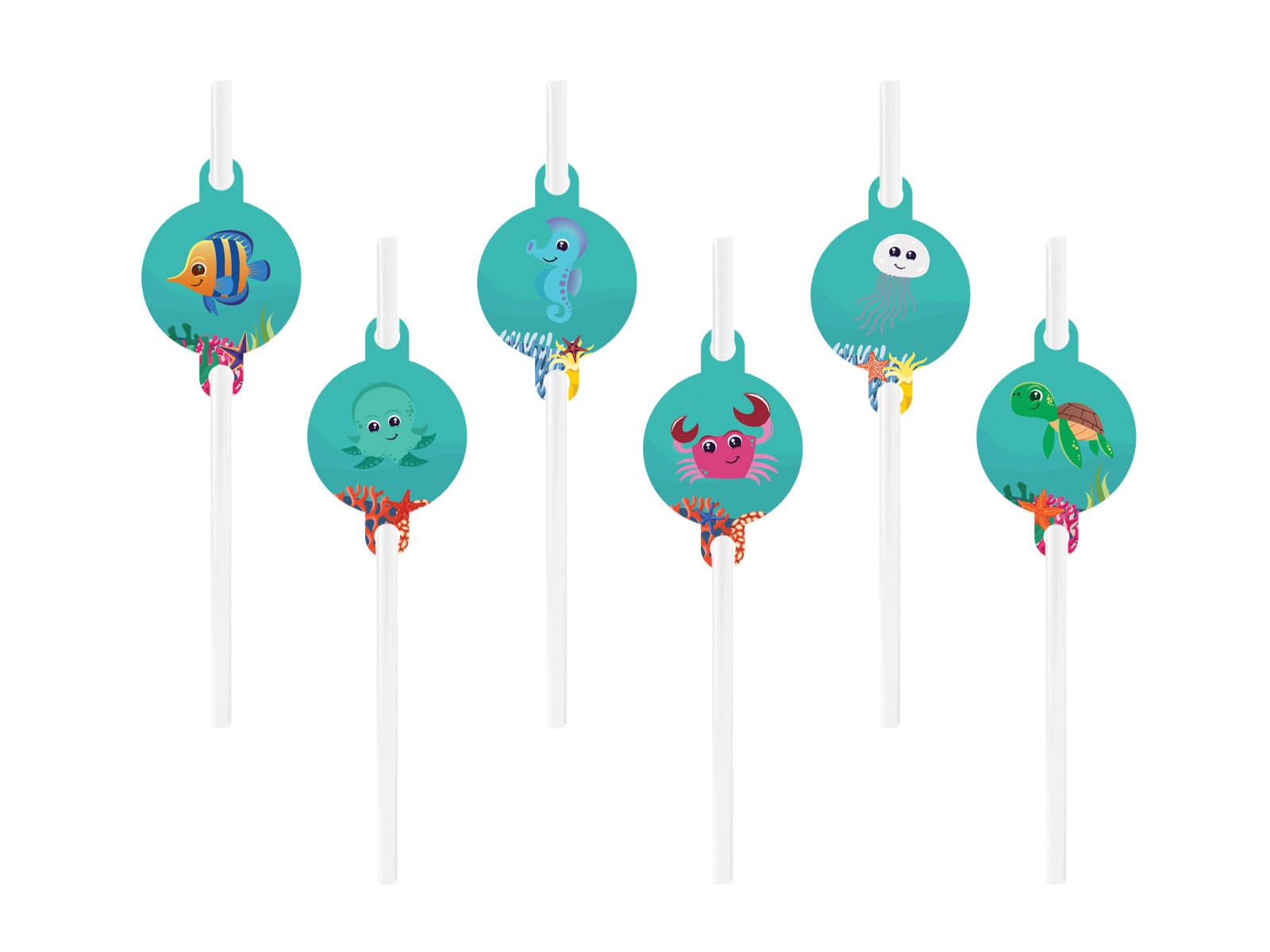 Słomki papierowe Podwodny Świat będą pięknie się prezentować podczas przyjęcia z morskim motywem. Błękitne medaliony, na których znajdują się wodni przyjaciele, wraz z białą słomką tworzą wspaniałe połączenie kolorystyczne, które nada przyjęciu podwodnego charakteru.