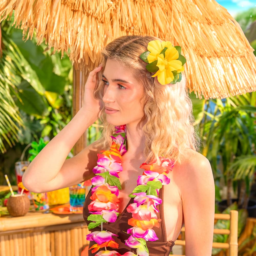 Słoneczny kolor sprawia, że spinka hawajska z żółtym kwiatem od razu przyciąga spojrzenia i poprawia nastrój. Idealna na urodziny, imprezy hawajskie i letnie spotkania. Dodaje lekkości i świeżości każdej stylizacji. To mały detal, który potrafi całkowicie odmienić wygląd. Jeśli szukasz czegoś prostego, a jednocześnie efektownego, ten akcent hawajski sprawdzi się perfekcyjnie.