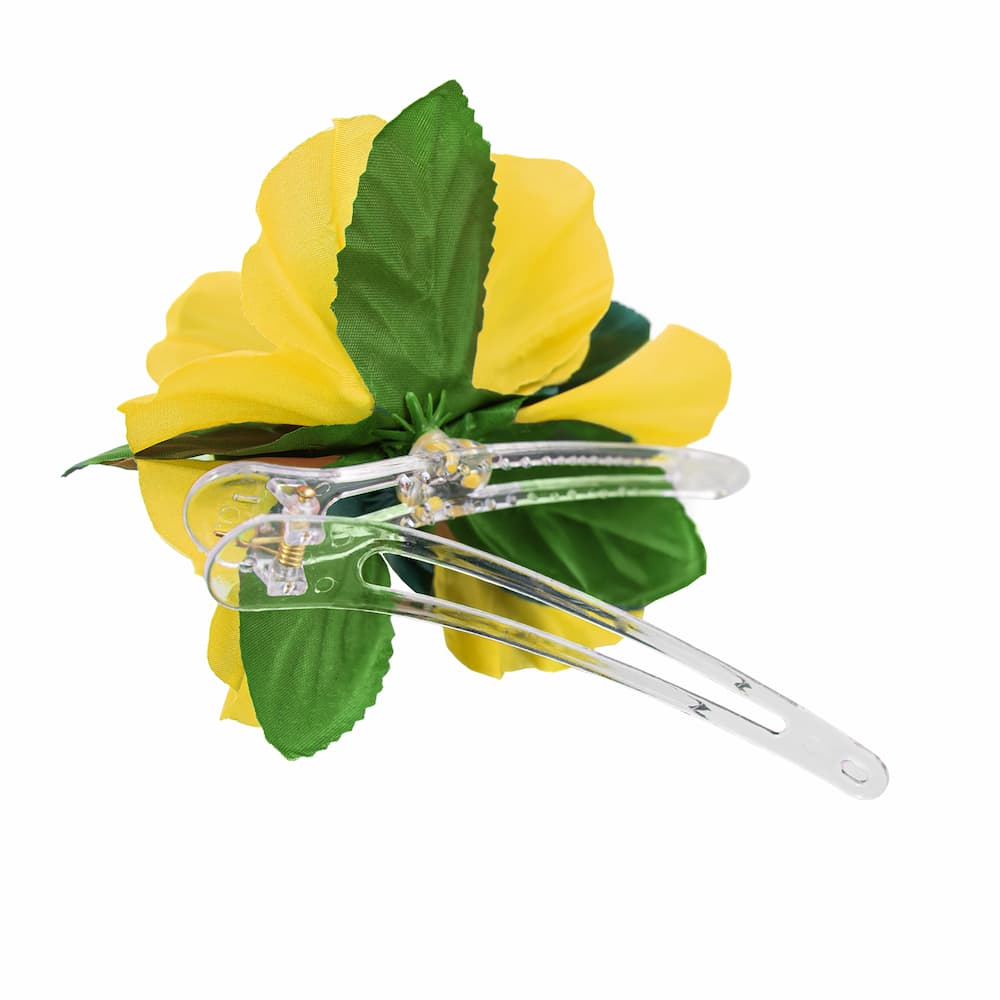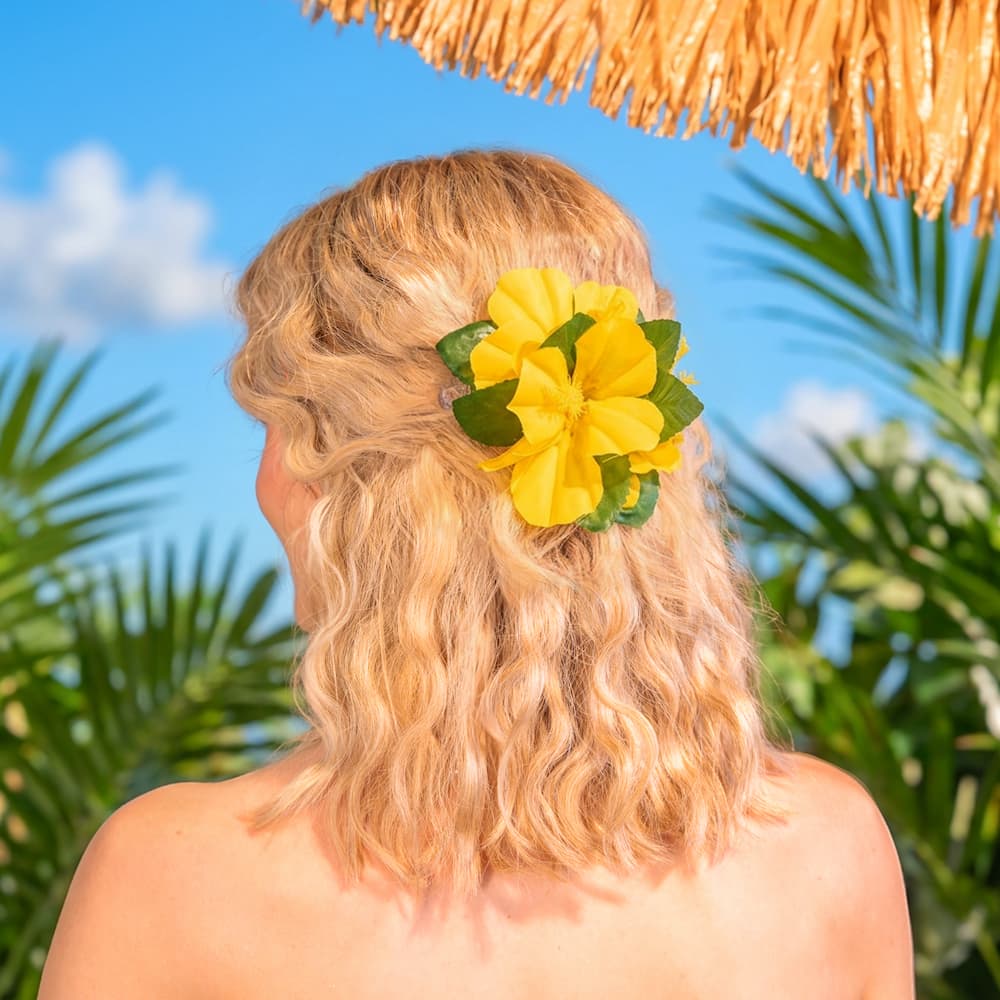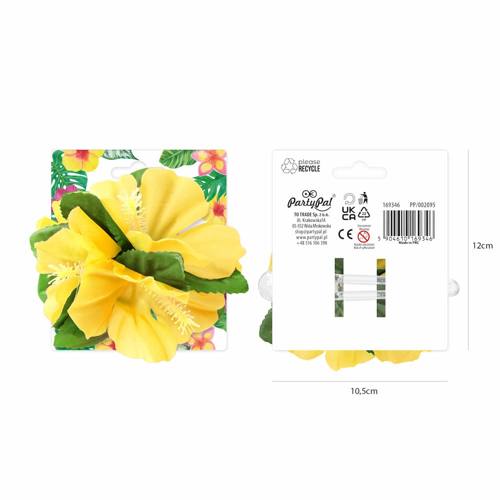 Hawajska spinka do włosów z żółtym kwiatem ma średnicę ok. 12 cm. W opakowaniu znajduje się 1 sztuka.