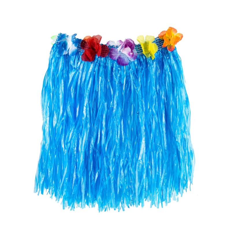 Niebieska spódnica hawajska ma długość ok. 40 cm i obwód ok. 55-95 cm. Zapinana jest na rzep oraz posiada gumki w pasie. Wykonana jest z syntetycznego materiału. Opakowanie zawiera 1 sztukę.