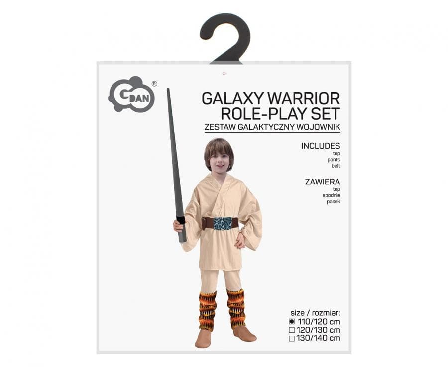 Przebranie Galaktyczny Gwiezdny Wojownik Jedi jest w rozmiarze 130/140 cm. W skład stroju wchodzą: koszula, spodnie, pasek. Wykonany został z poliestru. Zestaw nie zawiera miecza.